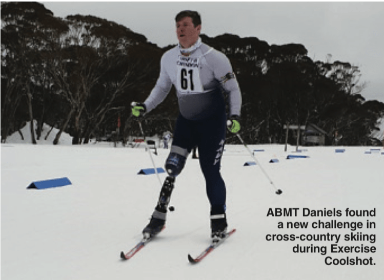 Anybody who saw Australian Ninja Warrior recently may know that AB Mark Daniels loves a challenge. Having endured an above-knee amputation, Mark’s career in the Royal Australian Navy is sadly coming to an end; but he is making sure he leaves in style. He has recently competed in the Invictus and Warrior Games, and was happy to answer the call from LCDR Gary Steiger, a member of the RAN Biathlon team, to take part in a proof of concept trial as the ADF’s first-ever Para-Biathlete, attending the ADF’s EXERCISE COOLSHOT, at Mount Hotham, Victoria.